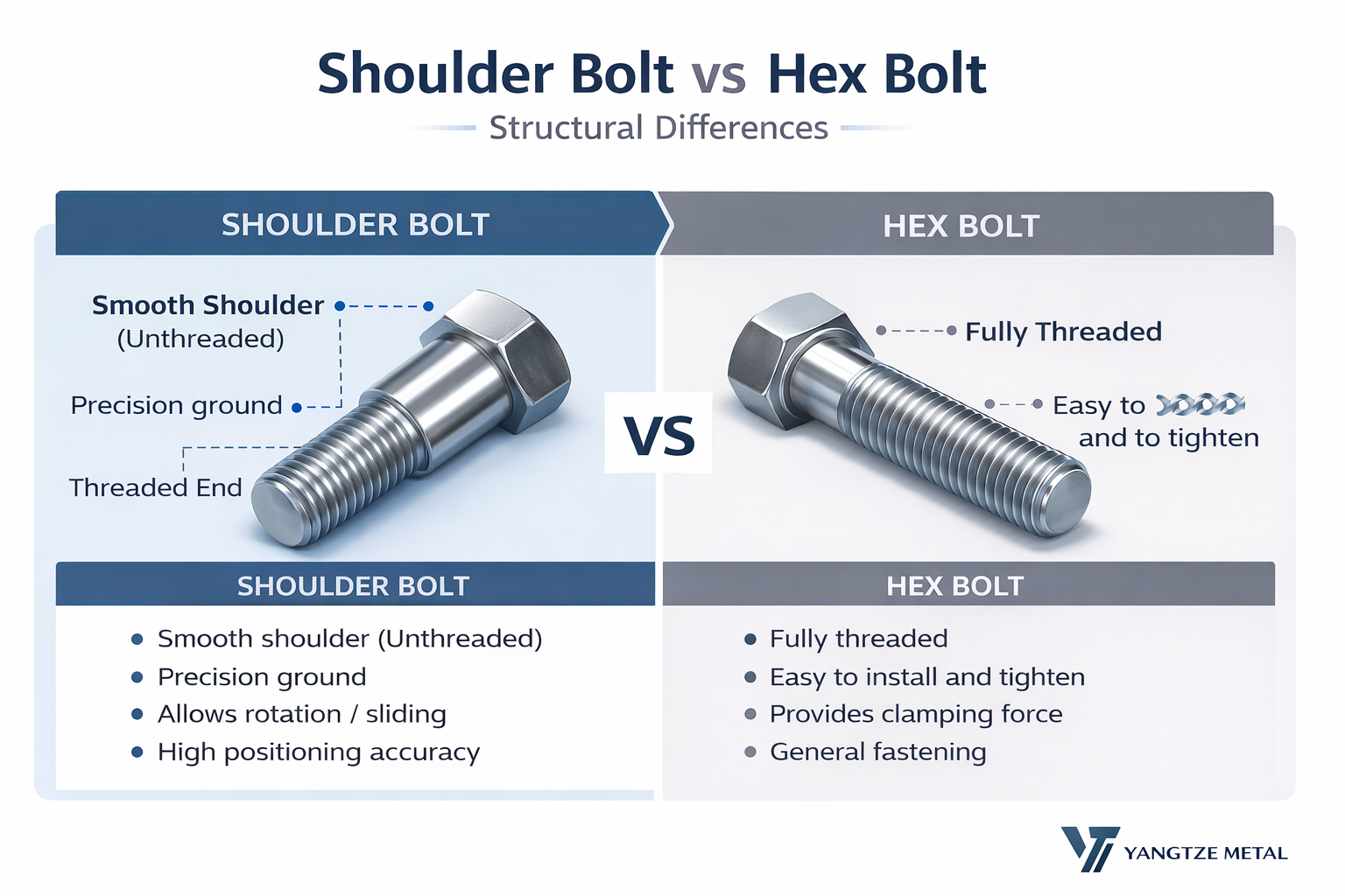 The table below highlights the key structural and functional differences between shoulder bolts and hex bolts.